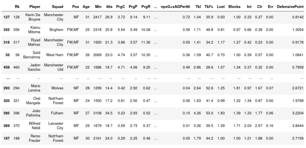 Untuk menjawab pertanyaan tersebut, saya mencoba mengolah data dari FBRef. Saya menggunakan data Standard Stats untuk melihat aspek menyerang dan Defensive Action untuk atribut bertahan. Dari data tersebut saya hanya membutuhkan data gelandang EPL yang telah bermain lebih dari 1.000 menit dan didapatkan 127 data pemain.