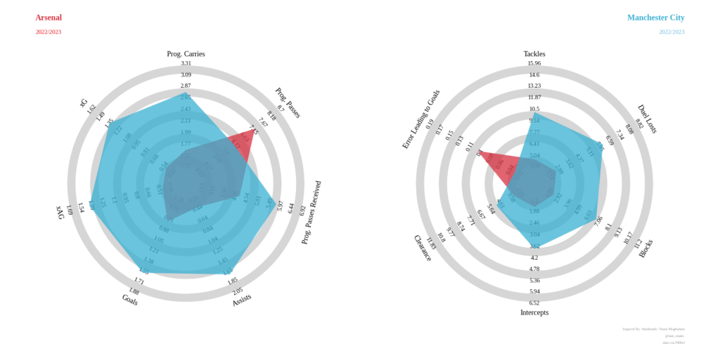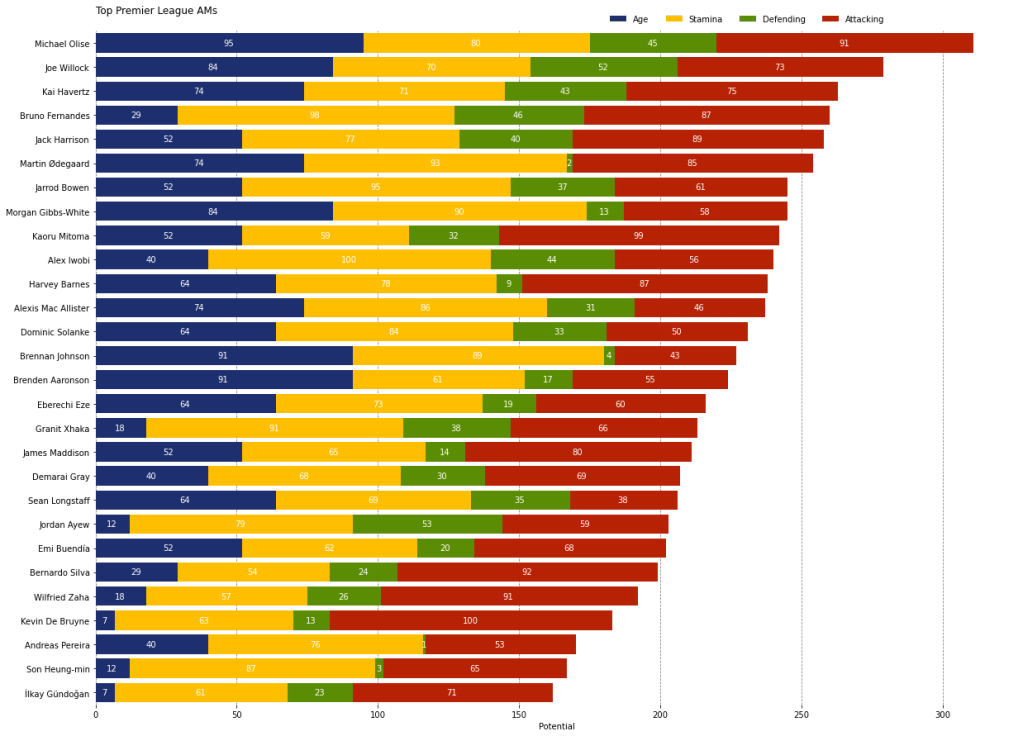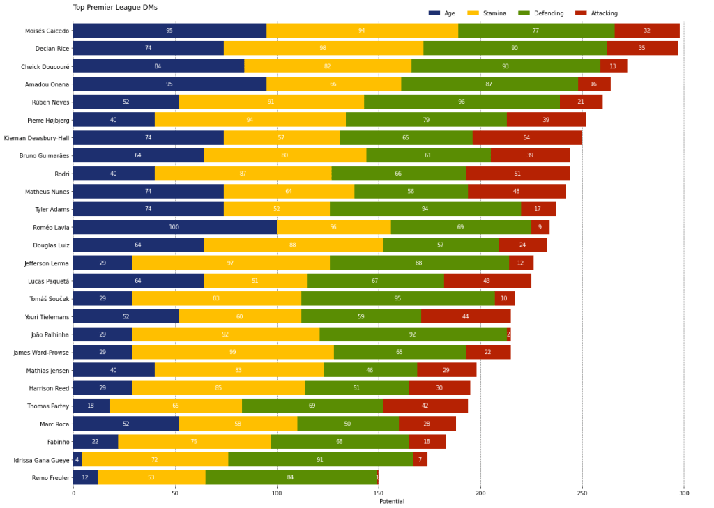 Mari kita cari dulu siapa saja gelandang bertahan di EPL. Dari data tersebut, pilih gelandang dengan atribut defensive lebih tinggi dibanding aspek menyerangnya. Jika Anda mengikuti rumor transfer, apalagi mengikuti akun media sosial Fabrizio Romano atau David Ornstein, lalu Anda melihat grafik di atas, Anda akan memahami mengapa Arteta begitu ngotot menginginkan Declan Rice. Sempat melirik Caicedo menjelang akhir musim 2022/2023, namun pada akhirnya mundur dan memberikan jalan seluas-luasnya untuk Chelsea.