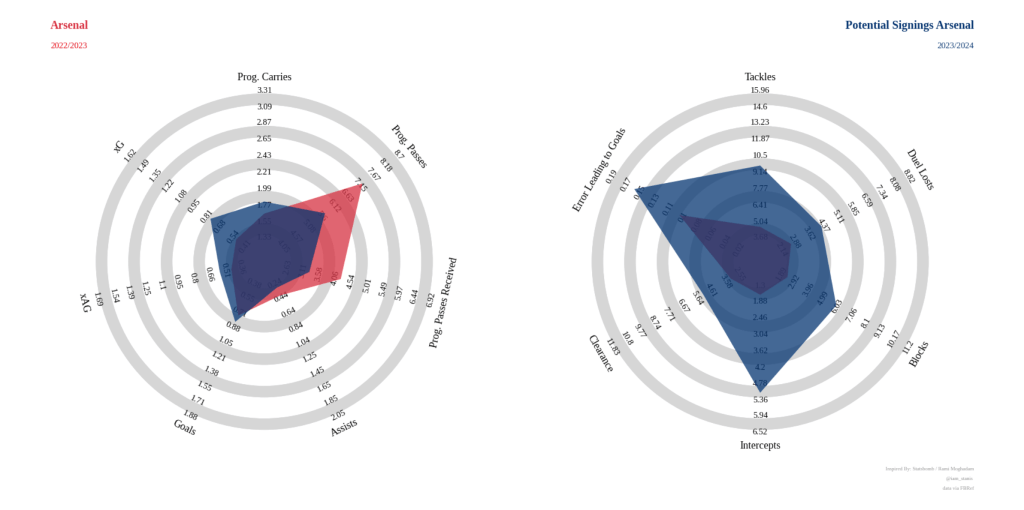 Untuk aspek menyerang, Arsenal lebih menyukai gelandang kreatif yang mampu membuat peluang dan memberikan umpan progresif. Namun, pada diagram di atas, Arsenal di musim mendatang perlu gelandang yang tidak hanya membuka ruang dan menerima umpan namun juga memiliki keberanian untuk melakukan dribbling progresif selain aktif berkontribusi dalam memperbesar peluang terciptanya gol.
